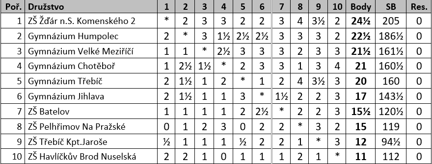 a Gymnázium Humpolec ve složení Krčil M., Kozojed L., Trtík P., Havlů J., Kavřík Š. kontakt: 565 502 210 Kulczycki M. kulczycki.matej@gymhu.cz Podrobné výsledky turnaje: Chess-Results Server Chess-results.com – Krajské kolo přeboru družstev škol Vysočiny 2026 kat. 2