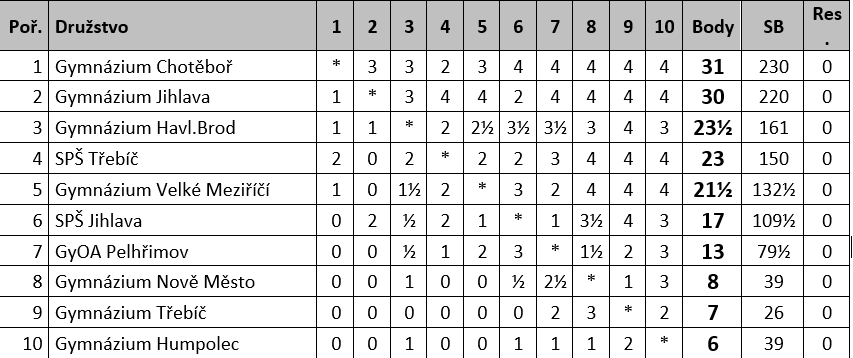 Postup do celostátního kola si vybojovalo Gymnázium Chotěboř ve složení Pejřimovský, Pejřimovská, Fousek, Hudík kontakt: 605966601 Jakeš M. jakes@gch.cz a Gymnázium Jihlava ve složení Rybáčková, Rybáček, Stejskal, Srba, Lahoda kontakt: 777983355 Kodet J. jankodet@gymnaziumjihlava.cz
